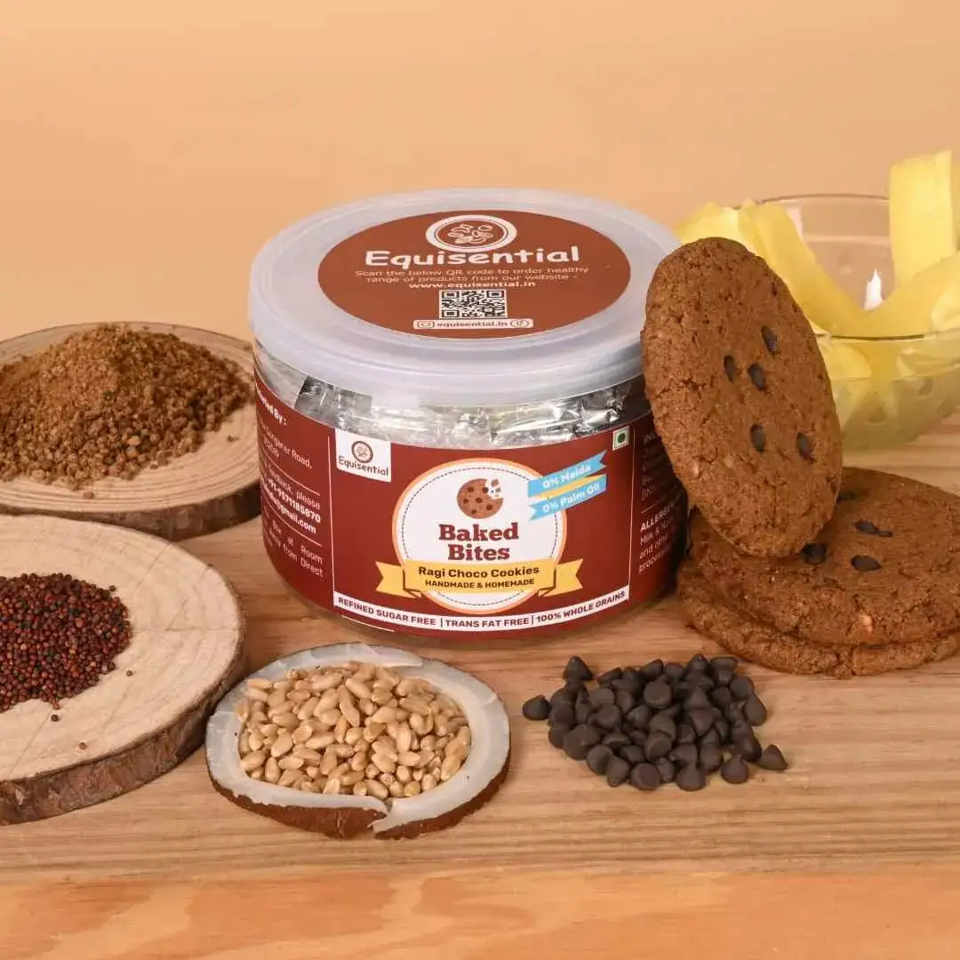 Our Baked Ragi Choco Cookies available online are made with all natural ingredients and are a perfect balance of flavors and textures from the ingredients like Ragi Flour and Wheat Flour, making them an irresistible healthy snack. Equisential Ragi choco Cookies aren’t just a healthy snack; they are also homemade Ragi Choco Cookies, which are completely Free of Refined Sugar, making these cookies an ideal choice for those seeking a healthy indulgent snack. It also comes with the goodness of handmade snacks, warmth, comfort, and care.