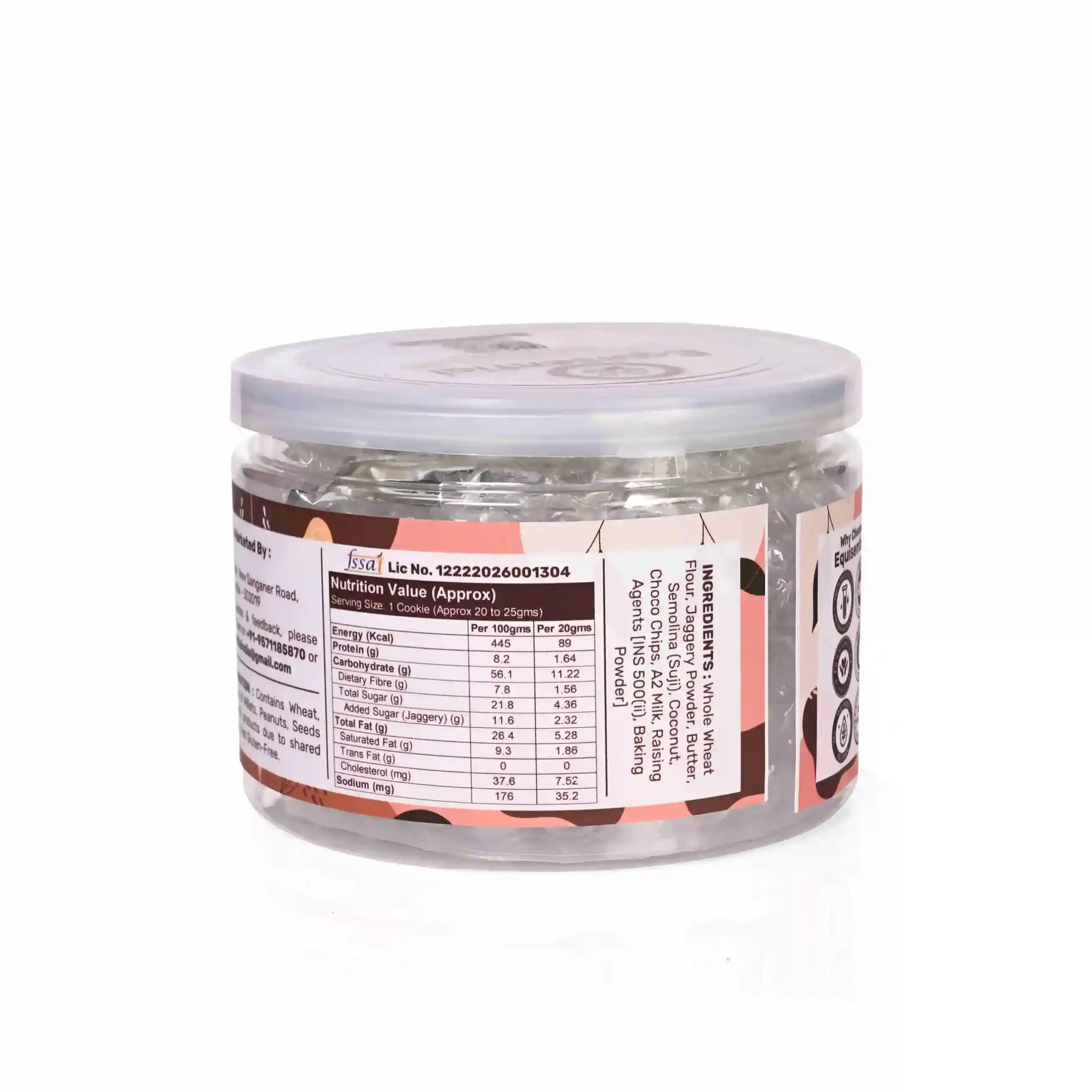 Whole Wheat Flour, Jaggery Powder, Butter, Semolina (Suji), Coconut, Choco Chips, A2 Milk, Raising Agents [INS 500(ii), Baking Powder].